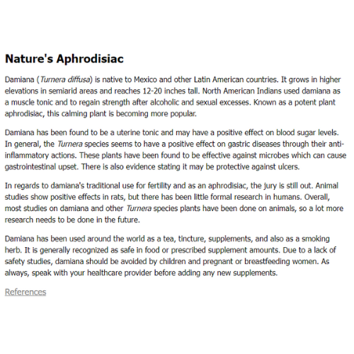 Keywords: damiana, Turnera diffusa, natural aphrodisiac, uterine tonic, anti-inflammatory, fertility